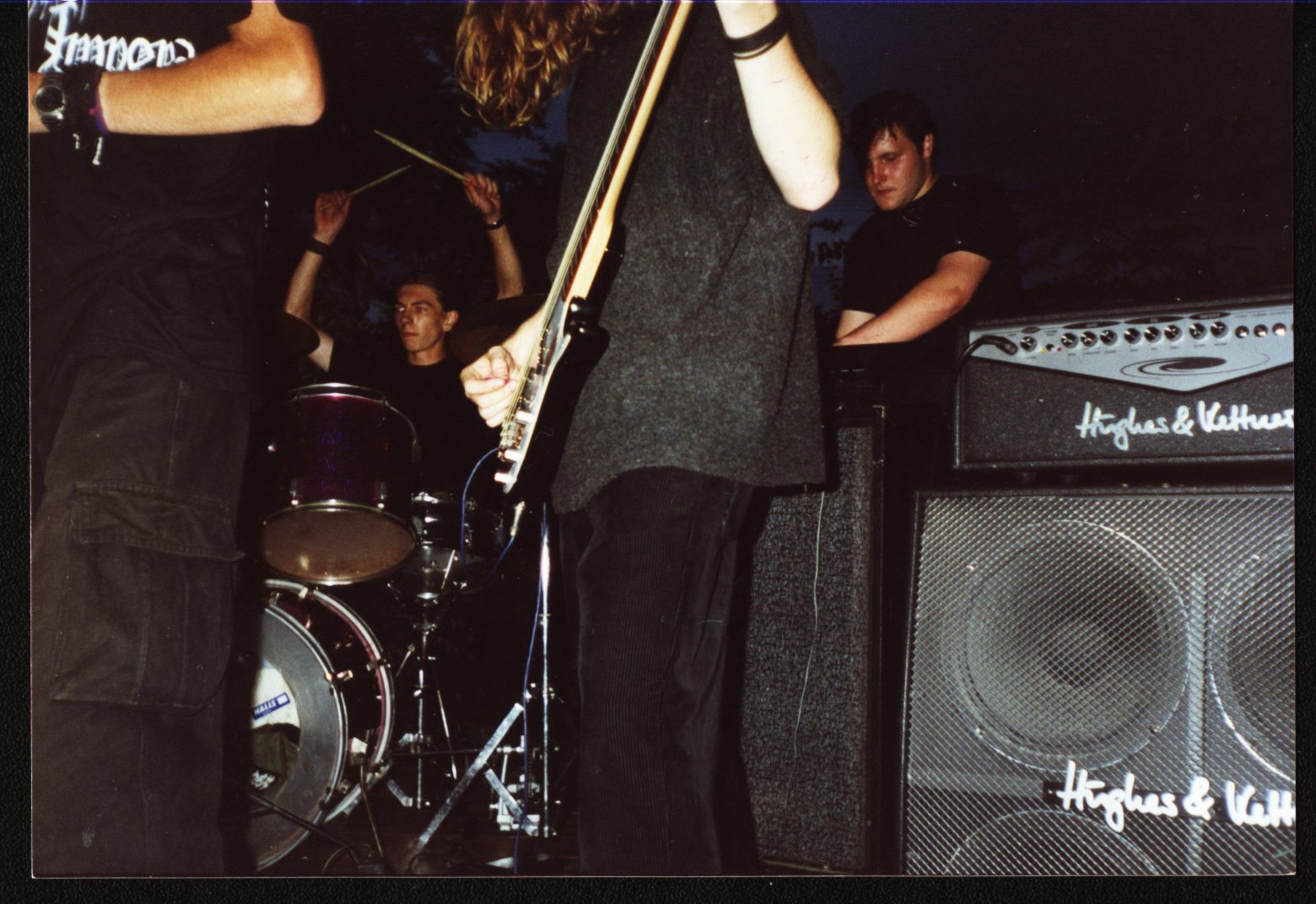 Wróćmy do DIVIDE ET IMPERA. W końcu w pełnym składzie grają próby, a jakże, w garażu. Łukasz: „Graliśmy w garażu koło cmentarza. Po przeciwnej stronie swój garaż mieli Bimbeer i El Chupacabra. Należał do rodziców Rudego. Początkowo nie było w nim żadnego wytłumienia, nawet wytłaczanek, więc dudniło strasznie. Potem trochę się tym zajęliśmy. Pamiętam, że na początku była tam jakaś perkusja, nie wiem skąd i do kogo należała. Taki ogryzek na wpół rozwalony. Po jakimś czasie Ozz!e wyhaczył zestaw za 300zł. Taki składak: trochę Polmuza, trochę Amati. Oczywiście Amati to już był dla mnie powód do radości. Zestaw razem z blachami, więc fajna okazja. Jeśli chodzi o resztę sprzętu to pamiętam, że Drako miał jakiś wielki wzmacniacz, który bardzo fajnie gadał. Sagi musiał nosić ciągle swoje klawisze na próby, a lekkie nie były. Ja się potem dorobiłem drugiej centrali. W garażu grało się zajebiście. Oczywiście nie bylibyśmy sobą, gdybyśmy czegoś nie odwalali. Robiliśmy np. takie pseudokoncerty. Otwieraliśmy drzwi do garażu, znajomi się schodzili, odpalaliśmy sprzęt, 20 osób przed garażem, otwieraliśmy napoje i graliśmy dopóki policja nie przyjechała. 🙂 Mimo, że garaż był w stronę cmentarza to niosło się. 🙂 „ O garażu, w którym grało DEI poczytacie także we spisie o zespole DIll Moon, w którym potem grał na gitarze Marek Kuśmirek.
