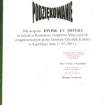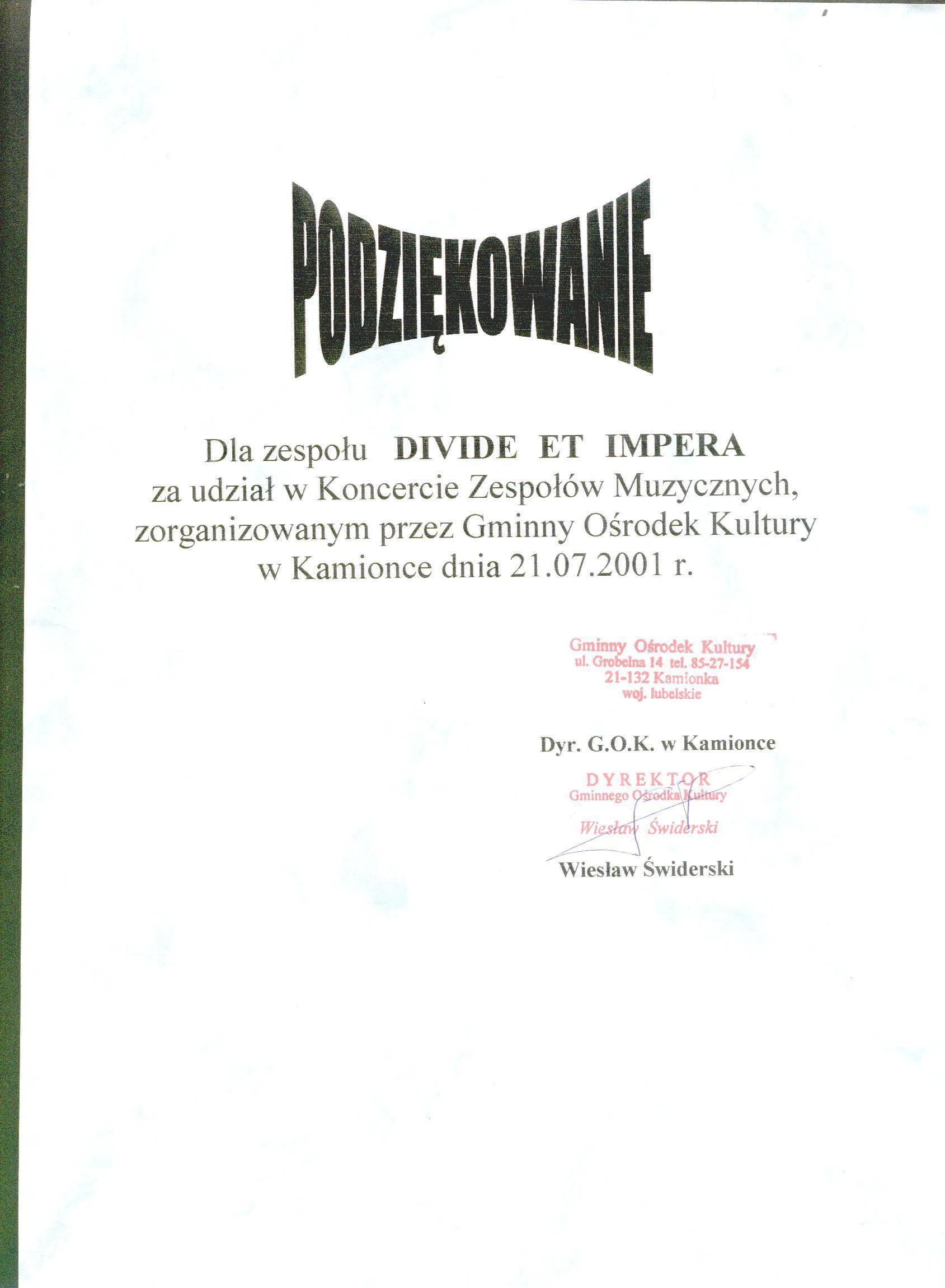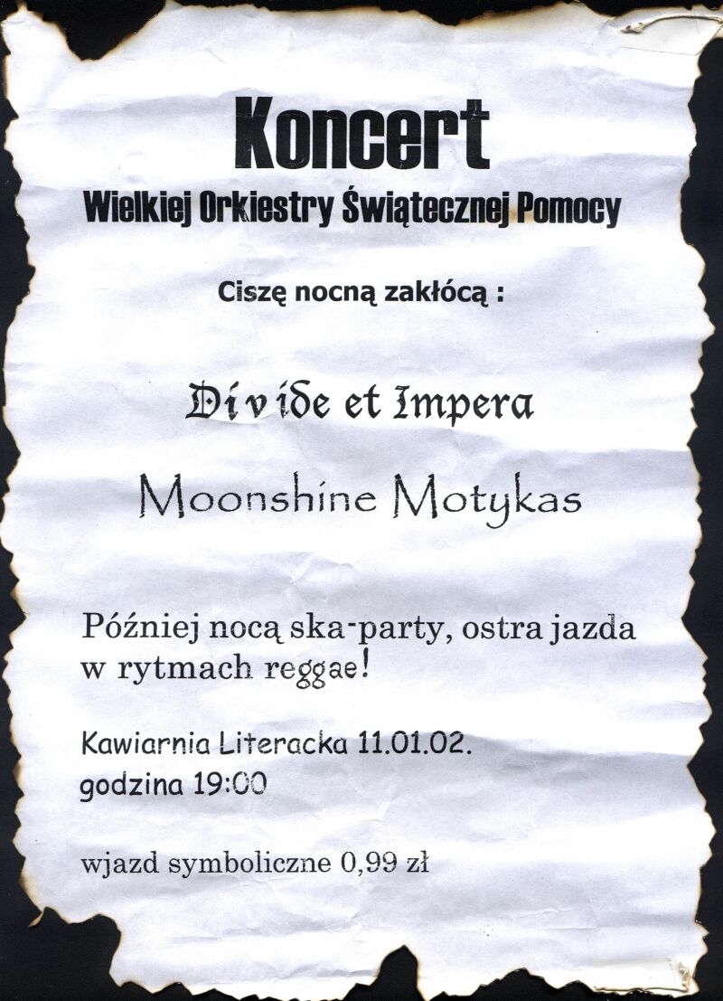 Jak każdy zespół, DIVIDE ET IMPERA koncertowali. Ale czy tylko w otwartych drzwiach garażu? Łukasz: „Koncerty zacząłem grać praktycznie z marszu. Jak dołączyłem to już był w planach koncert w Kozłówce w remizie. Pamiętam, że przybyło bardzo dużo ludzi, bo fama już jakaś o nas poszła i ludzie byli ciekawi. Mieliśmy wtedy ze 4 numery, czyli jakieś 20 minut muzyki. Potem był koncert w Kamionce. W sumie grały 3 kapele, z czego my byliśmy najmocniejsi. Chyba publiczność nie była do końca przygotowana na to co reprezentujemy. 🙂 Pamiętam też, że koncert zakończyli miejscowi skinheadzi, którzy go rozwalili. Totalny chaos, bijatyka i chowanie sprzętu w pośpiechu. Takie były czasy. Potem jednak była gruba impreza. 🙂