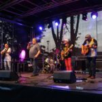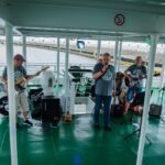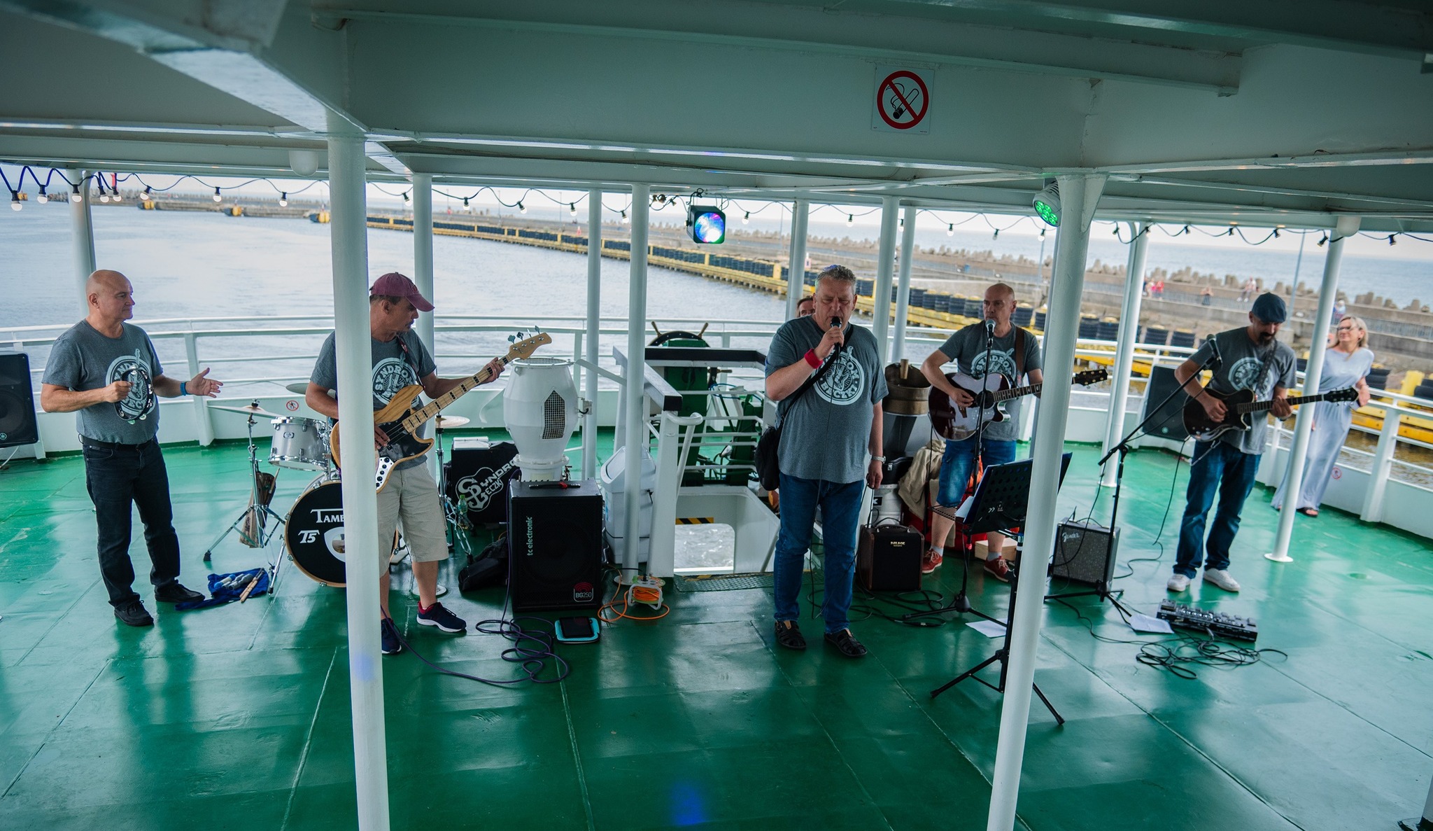 SYNDROM BECZKI lubi grać koncerty. Występują na prawdę dużo i gdziekolwiek mogą. Zespół jest w stanie zagrać autorski koncert złożony tylko z własnego repertuaru, ale także może dać koncert 2, a nawet 3 godziny dokładając do swoich numerów, covery i popularne standardy szantowe. Mało tego, wyrobili sobie już taką markę, że mają stałe miejsca, w których grają regularnie. U nas jest to Stara Łaźnia, ale SYNDROM co roku wraca także do Tawerny Rozbitek w Wilkasach, koło Giżycka na Mazurach. Panowie już mają w kalendarzach termin lipcowego koncertu w tym miejscu i to będzie już 5 raz, kiedy tam zagrają. Przychodzi na ich koncert wyrobiona publiczność, a kapela serwuje im kilka godzin muzyki. Właściciele Rozbitka podobno zaraz po występie wysyłają maila z zaproszeniem na kolejny rok. Z ciekawszych miejsc, gdzie SYNDROM występował wymienić trzeba koncert dla Radia Rzeszów. Rejestrowany i nadawany przez tę rozgłośnię. No i oczywiście koncert na pełnym morzu, który odbył się w lipcu 2024 na pokładzie katamaranu wycieczkowego Jantar. (T): „Nagrał nam ten koncert nasz przyjaciel Ludwik Rusznica. Wracaliśmy akurat ze Świnoujścia i po drodze w Kołobrzegu udało się zagrać koncert na statku podczas rejsu. Cała wycieczka trwała 2 godziny, ale przeżycie niesamowite.” (A): „Jak schodziliśmy już z pokładu to poszła fama, że muzyka na żywo jest na Jantarze i ludzie chcieli kupić bilety na kolejny rejs z nami, ale musieliśmy niestety wracać do domu.” Wspomnienia rewelacyjne, no i przede wszystkim zespół sprawdził się na wodzie. 🙂