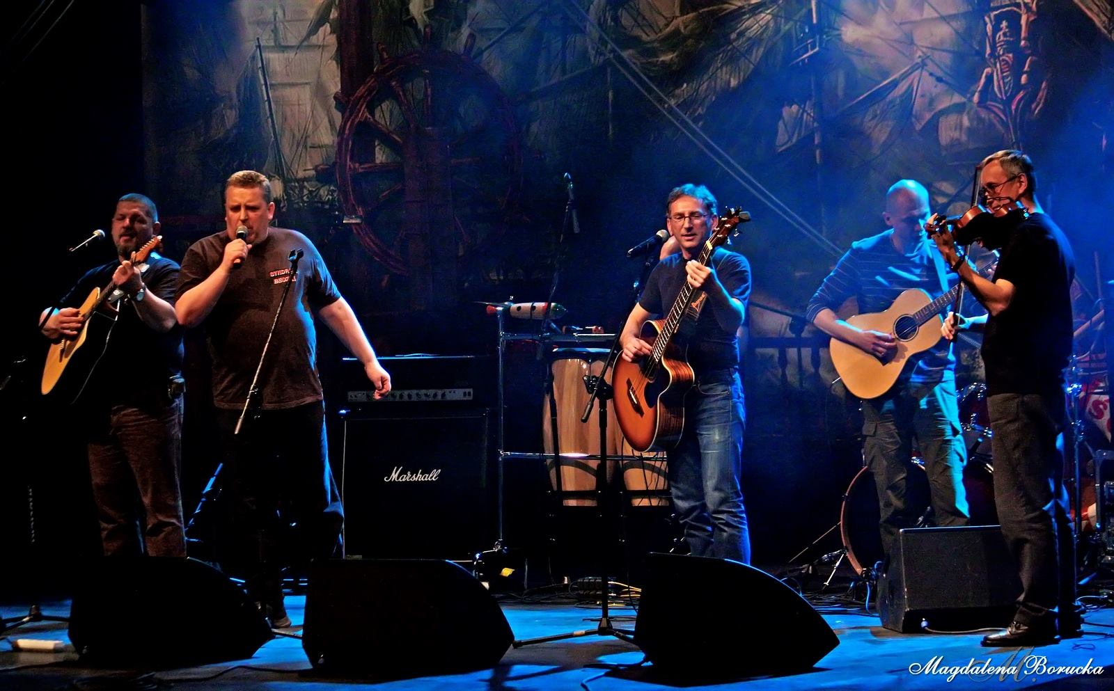 Jest bardzo fajne miejsce do grania, zespołowi pomysłów nie brakuje. A jak z dyscypliną? Andrzej w jakimś wywiadzie wspomniał, że w SYNDROMIE z obecności na próbie zwalnia tylko śmierć. 🙂 Czy jest tak faktycznie? (A): „Dyscyplina w zespole jest duża. Gramy próby dwa razy w tygodniu i trzeba na nich być. Wydaje mi się, że bez względu na to, w jakim momencie był zespół, to dzięki takiemu podejściu standardy rosły i cały czas rosną. W tej chwili kiedy gramy próbę i ktoś się pomyli, albo ja zafałszuję, to reszta zaraz o tym wspomni. Nie ma miękkiej gry, bo jak mamy się klepać po dupach, to po co mamy się spotykać? Gordon kiedyś siedział pół nocy i wymyślał solówkę. Zajęło mu to tyle czasu, bo powiedział sobie, że musi być melodyjna i przede wszystkim trudna do zagrania.” Sami widzicie, ludzie ambitni i stawiający na podnoszenie jakości przez systematyczną pracę. To jest chyba droga do sukcesu, ale zmusza ona też do tego, że ludzie muszą się ze sobą dotrzeć. (A): „Zawsze jak ktoś dochodził do zespołu to musiał się dopasować, a bywało tak, że niektórzy bardzo szybko rezygnowali. To jednak zależy od człowieka, bo przecież Jurek, który jest najstarszy, się wpasował, chociaż 50 lat bębnił co innego.” (T): „To jest jak puzzle. Po prostu człowiek musi pasować, żeby się ani zespół z nim nie męczył, ani dany człowiek z zespołem.” (A): „Wszyscy myślą, że jak hasło szanty to to jest taka prosta, banalna muzyczka. My staramy się jednak dbać o jakość i szczegóły, także podczas nagrań.”